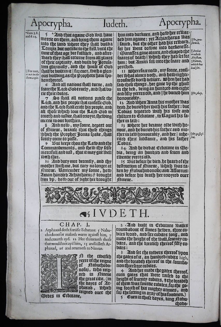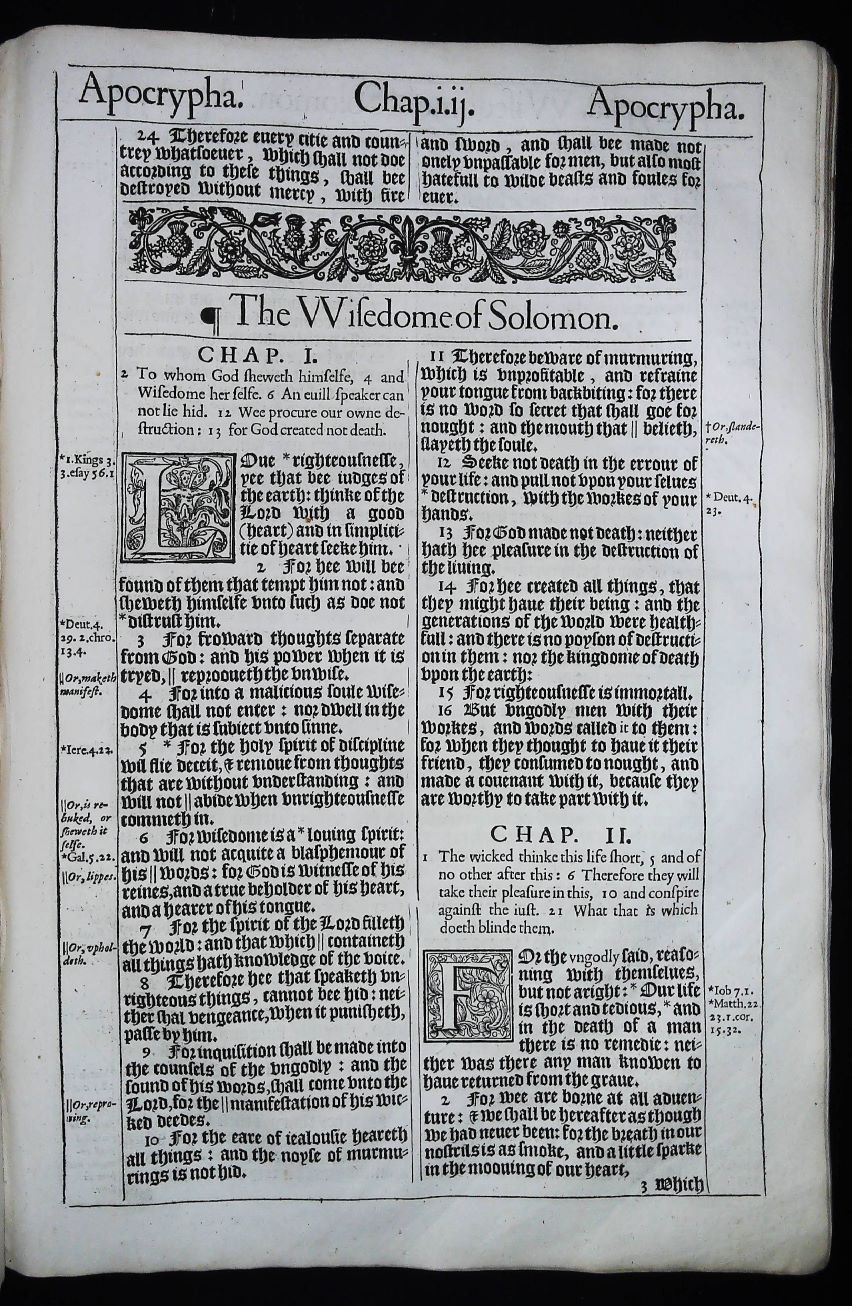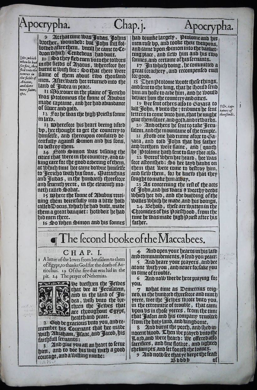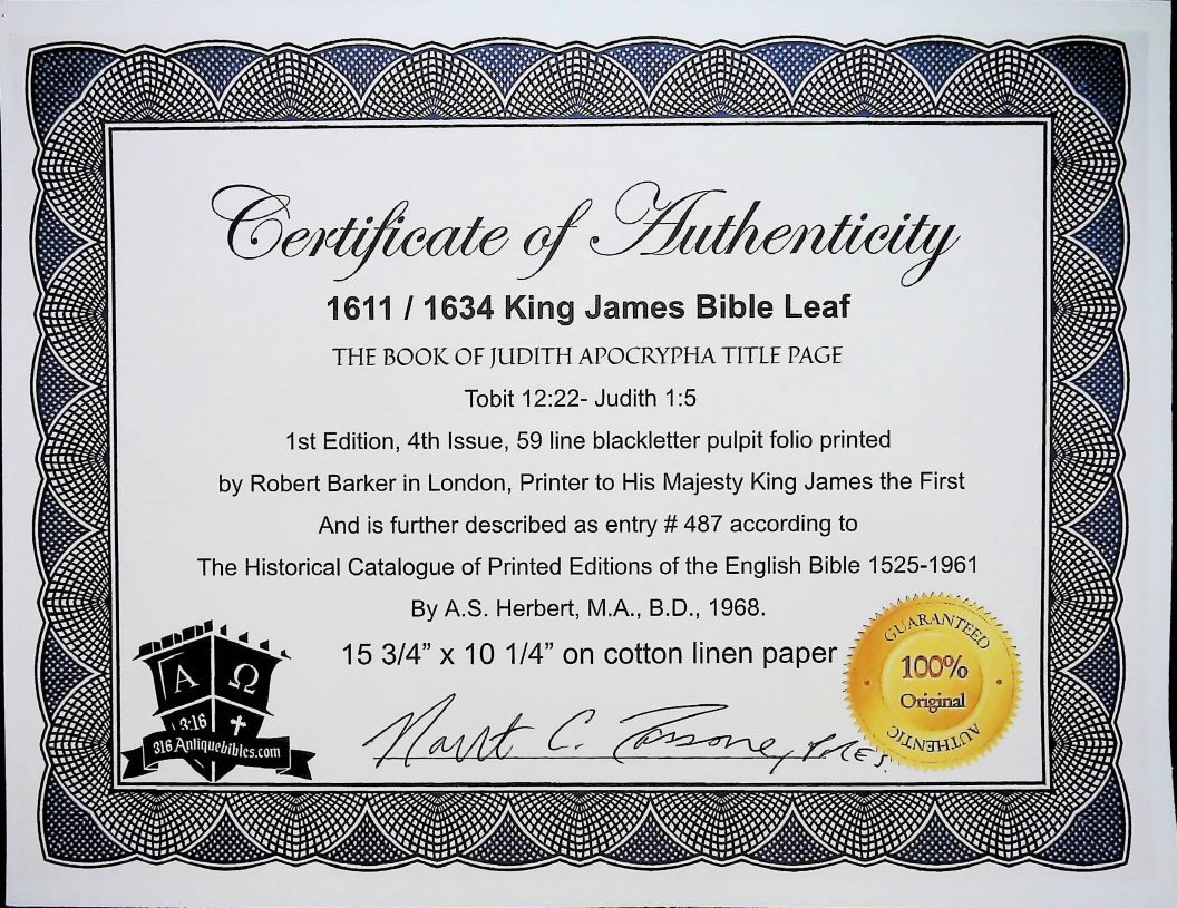 1611 King James Books of the Apocrypha Title Pages … Printed in London by Robert Barker and John Bill, printers to King James I, The “Authorized Version or The King James Bible” has remained the beloved translation of the faithful for over four centuries. With over a billion copies and in continuous print for over 400 years, no other book in history is its equal. The historic 1611 edition has 59 lines of Old English Blackletter type to the full page. It was issued 5 times in this pulpit folio format- 1611, 1613 /1611, 1617, 1634 and 1640 /1639 . This leaf was physically printed in the year 1634.