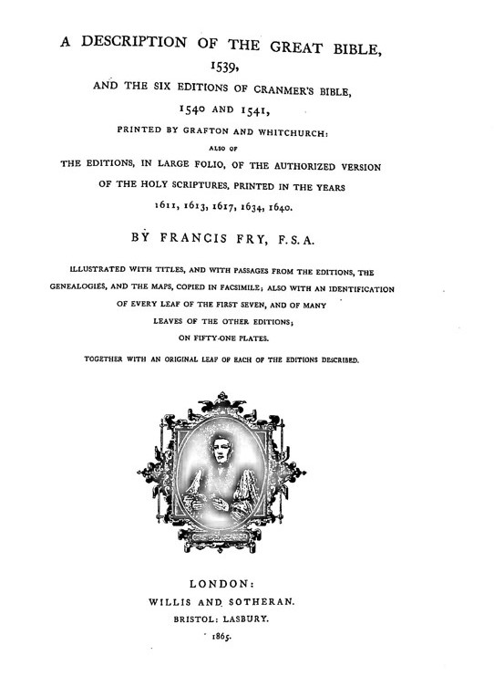 In 1863 he issued a couple of small rare pieces illustrative of Tyndale’s version, and in 1865 published his bibliographical treatise on the Great Bible of 1539, the six editions of Cranmer’s Bible of 1540 and 1541, and the five editions of the Authorised Version. Fry visited private and public libraries to collate different copies of these bibles. This work was followed by his account of Miles Coverdale‘s translation of the Scriptures, and his description of forty editions of Tyndale’s version, most of them having variants.